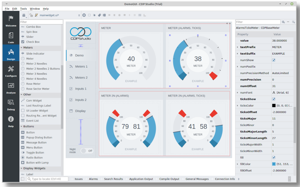 The HMI Designer includes a large set of ready-to-use widgets that are fully customizable through simple property settings. Several built-in themes define the global look and feel, with both day and night modes available.