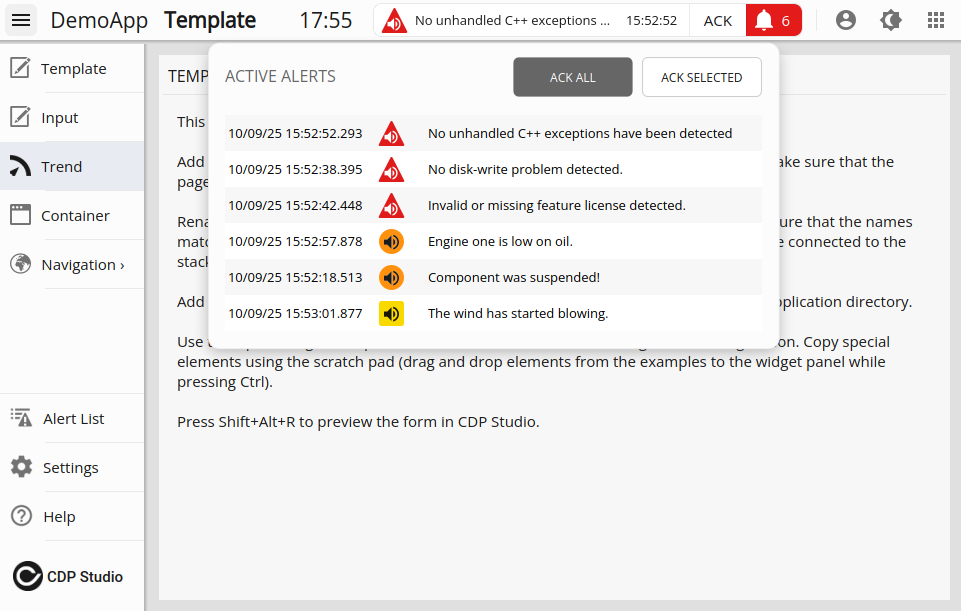 Stay on top of system events with a built-in alarm list that displays active alarms directly in your HMI. Operators can acknowledge alarms instantly, while historical alarms can be reviewed for analysis and troubleshooting. Configurable and integrated — ensuring safe and efficient operations.