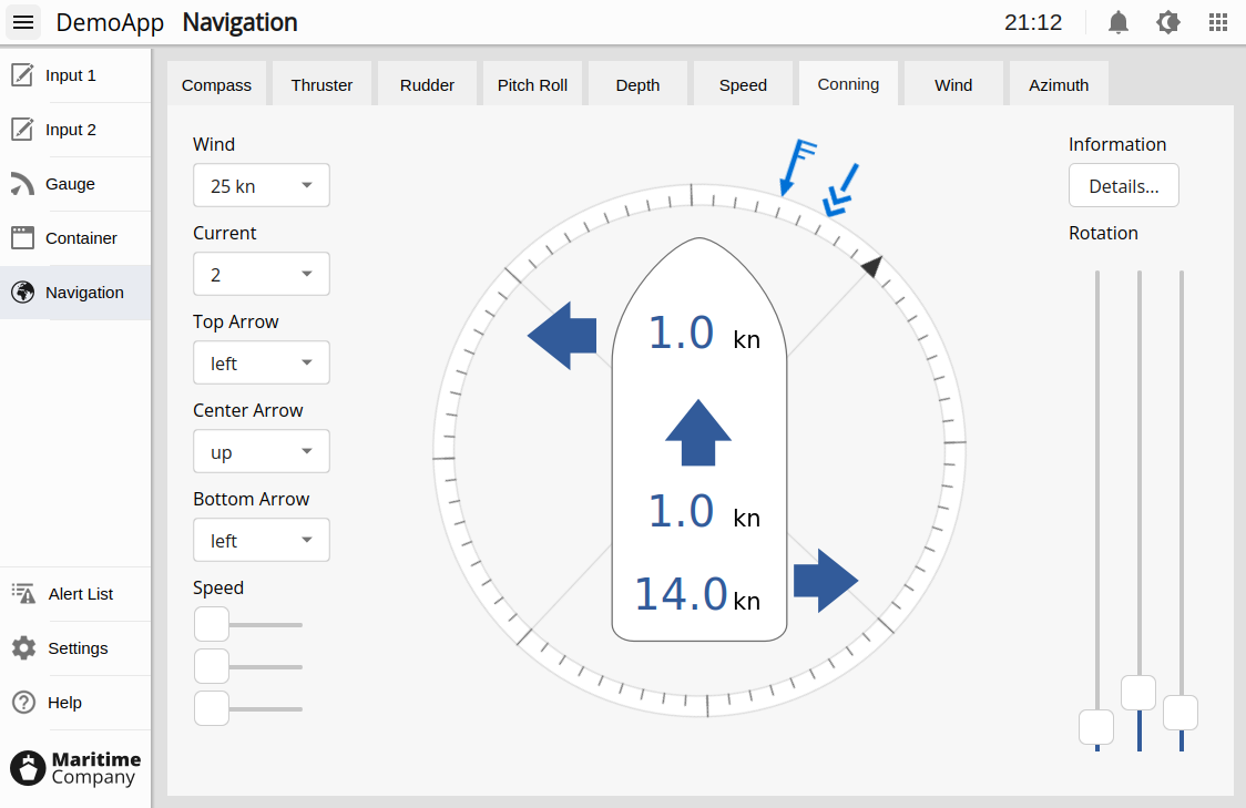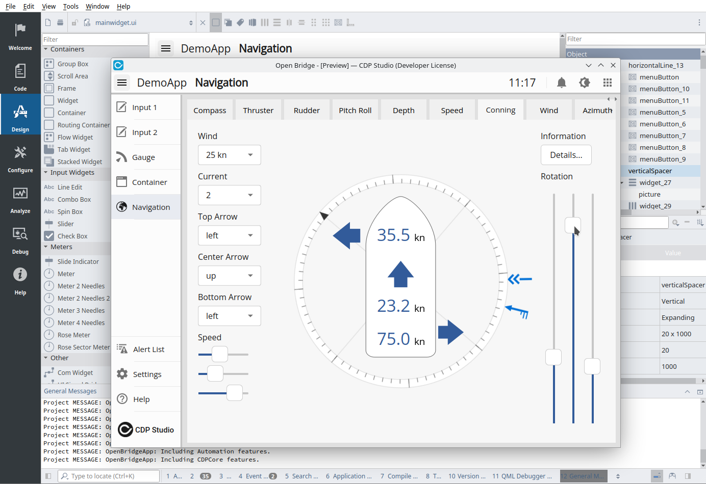 Complex interface components, such as the navigation instruments in Open Bridge, are created by mixing and stacking CDP Studio’s base widgets.