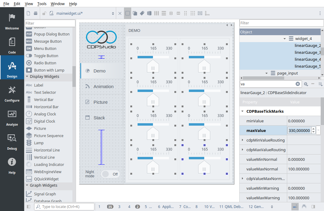 Each widget can be precisely adjusted through the property panel – from colors and labels to behaviors and signal bindings – giving developers full control without writing code.