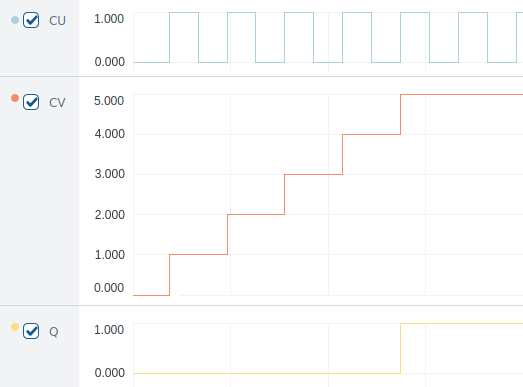 Below are the example plots for CTUOperator(PV=5) input (CU, cyan), count value (CV, orange) and output (Q, yellow).