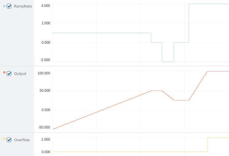 Below is an example plot of the changing RampRate input signal (cyan), the RampGenerator(StartingValue=-50, OverflowValue=100, StopOnOverflow=true) Output value (orange) and the Overflow value (yellow).