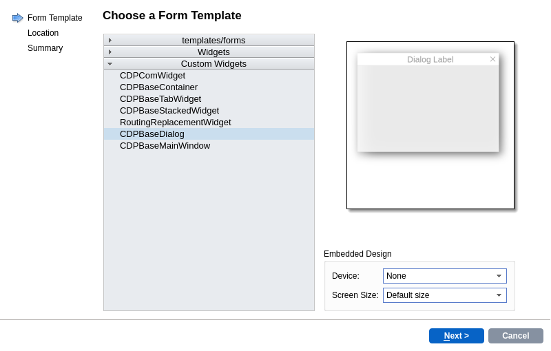 The dialogs loaded by buttons should be based on CDPBaseDialog. This will make the dialog follow the application theme, enable animations and other features as described in CDPBaseDialog. The dialog is created by right clicking on the GUI application in Code mode Project tree and selecting "Add New...". In the wizard, select "Qt" -> "Qt Designer Form" and click "Choose...". In the next page, select "CDPBaseDialog" from the "Custom Widgets" section as the Form Template and continue with the wizard. The defaults should be fine in the remaining steps.