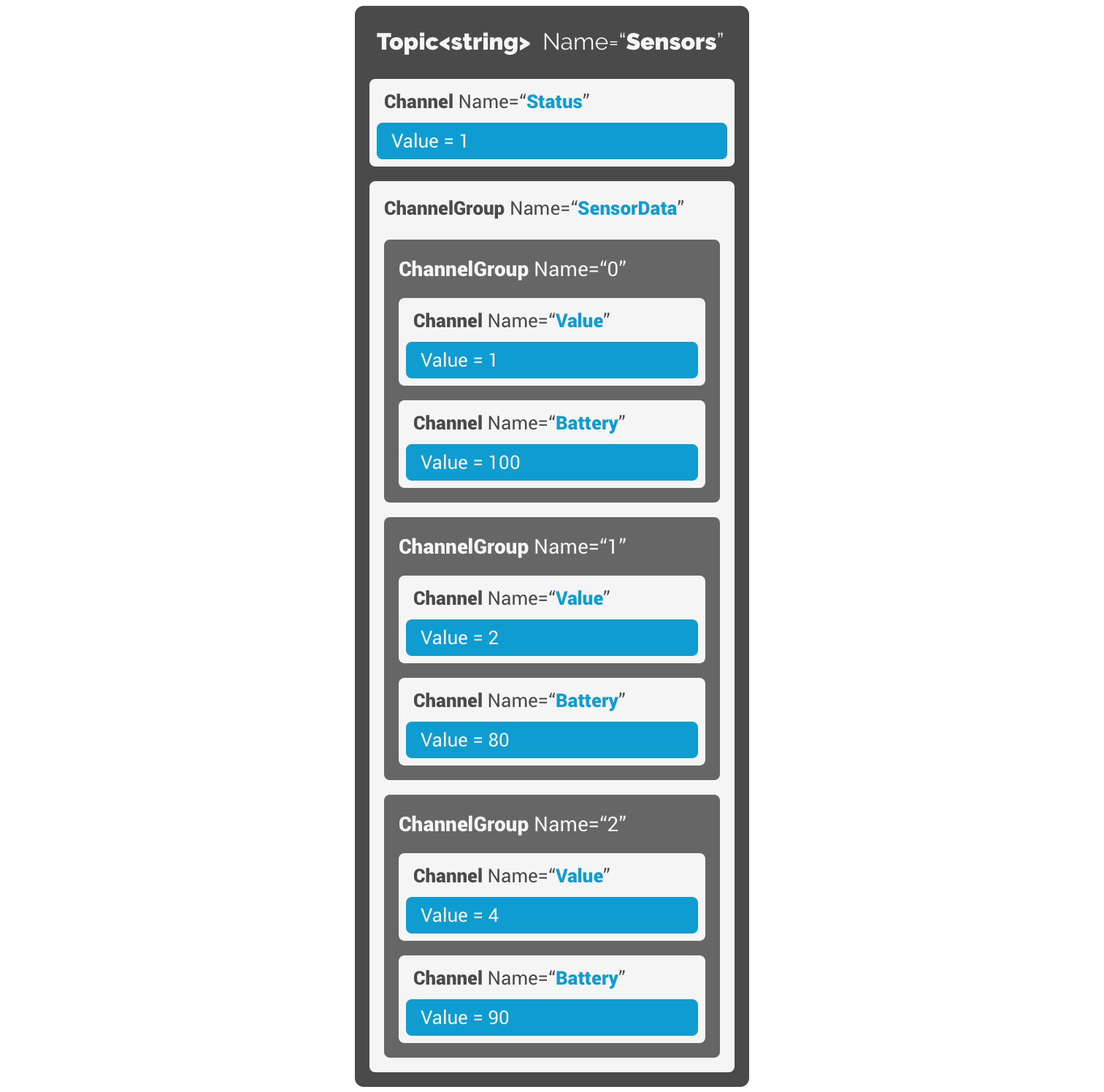 For more complex JSON objects, nested ChannelGroups can be added. Using them recursively, Channel and ChannelGroups hierarchy can be created that match any JSON object hierarchy.