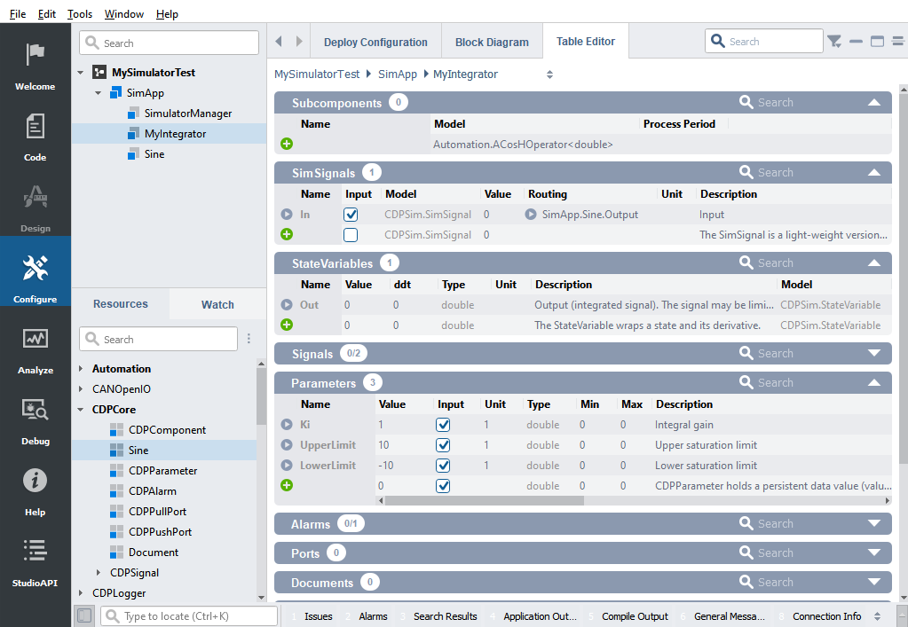 This Integrator simulator-component has an input CDPSim::SimSignal called In, where you may set the Routing to wanted input-signal. The CDPSim::StateVariable called Out is the calculated output (integrated signal). The Out value is limited by the two CDPParameters called UpperLimit and LowerLimit, which you may set to wanted values. There is also a CDPParameter Ki, which is the integral gain (it is multiplied with he derivative of the StateVariable Out).