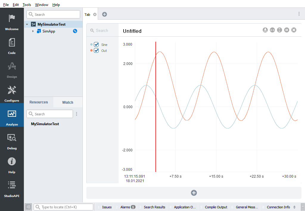 Run your system, go to Analyze mode and graph the signal SimApp.Sine.Output and the StateVariable SimApp.MyIntegrator.Out.