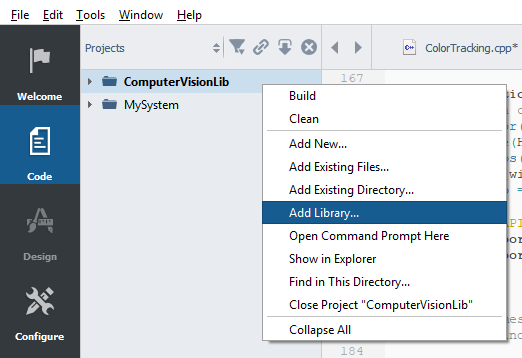 To use OpenCV in your CDP application one should first create a CDP library project. Next one must add OpenCV dependency to this library. For that go to Code mode, right click on the library project and select Add Library...