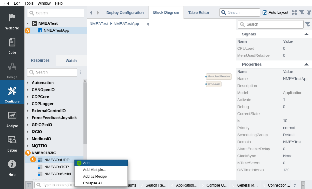 Create a system named NMEATest with a Console application named NMEATestApp, then select Configure mode. See How to Create a system for more information.