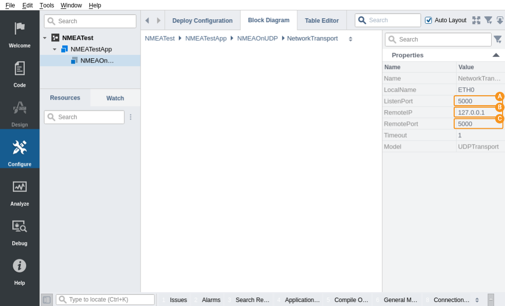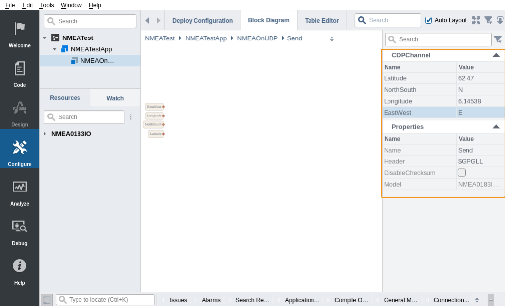 - Make sure that the NMEAOnUDP component is selected in the Project tree, and that the IOConfig table is visible