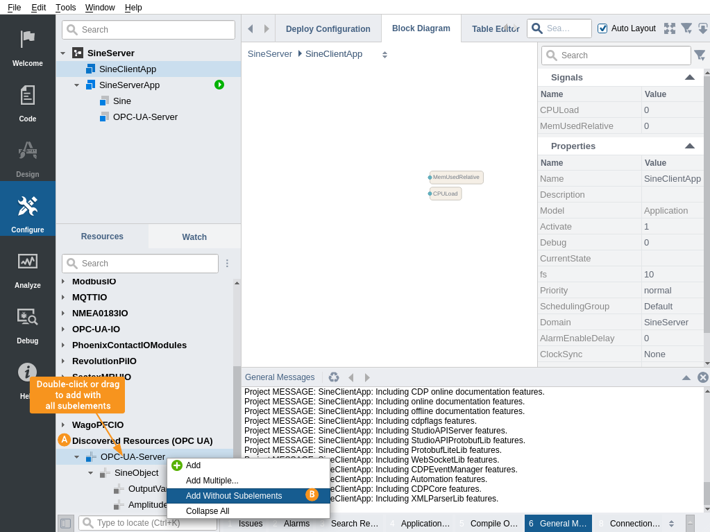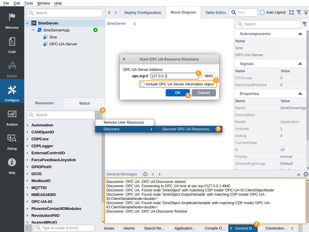Discovery is then started. OPC UA server is contacted, its application name is fetched and all nodes in the server are browsed. Discovery process result log is displayed in Studio General Messages pane .