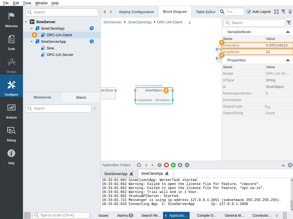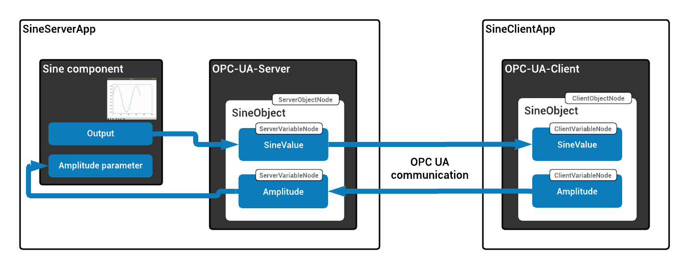 - The OPC-UA-Client component with corresponding nodes is created and added to the SineClientApp