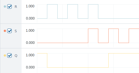 Below are the example plots for RSOperator reset input (R, cyan), set input (S, orange) and output value (Q, yellow).