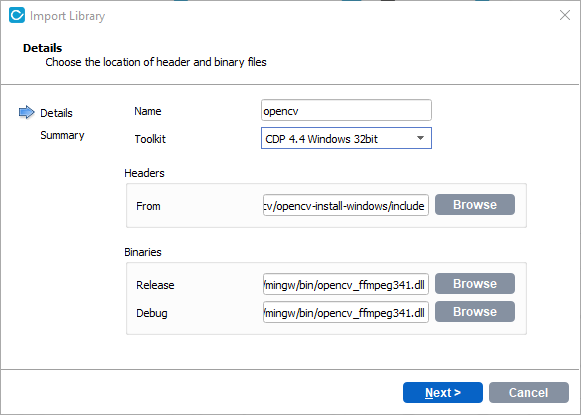 Note: Import Library... dialog must be run for both host and target platforms. For example, when developing a CDP system using OpenCV on Windows and deploying it on Raspberry Pi, the dialog must be run once for Windows binaries and once for Raspbian binaries. Make sure to set the Name field to opencv each time.