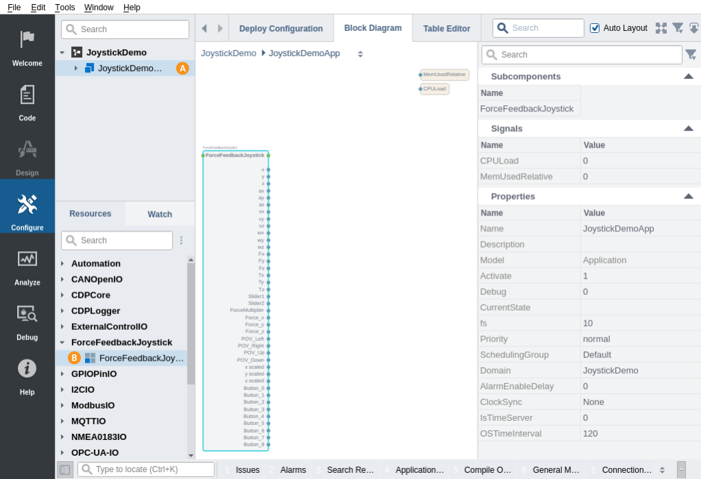 Create a system named JoystickDemo with a Console application named JoystickDemoApp, then select Configure mode. See How to Create a system for more information.