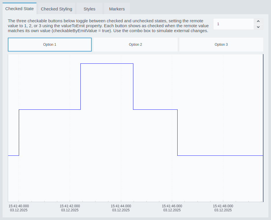 This example shows how checkable buttons can display their checked and unchecked state based on a remote value. Each button uses the valueToEmit property to write a specific value to the control system (1, 2, or 3). A button automatically appears checked when the remote value matches its own, using checkableByEmitValue = true. A spin box lets you simulate external changes so you can see how the visual state updates in real time.
