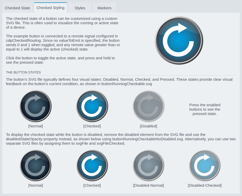 This example demonstrates how the checked state of a button can be customized using SVG styling. A single SVG file defines separate graphics for normal, checked, pressed, and disabled states. When connected to a remote value via routing, the button switches its appearance dynamically to reflect the running or active state of a device.