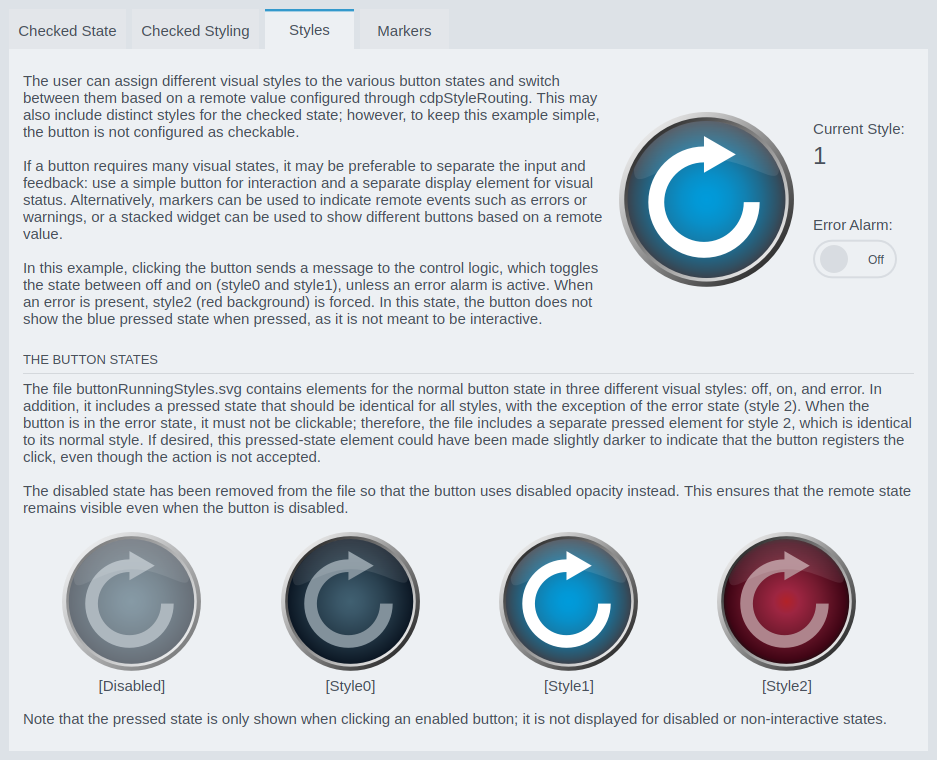 This example shows how a button can switch between multiple visual styles based on a remote value, using cdpStyleRouting. The button cycles between style 0 and style 1 when clicked—unless an error is active, in which case style 2 (red) is forced. This demonstrates how to combine normal operation with error signaling. The accompanying SVG file includes versions of the button graphics for each style and a pressed version for allowed states.